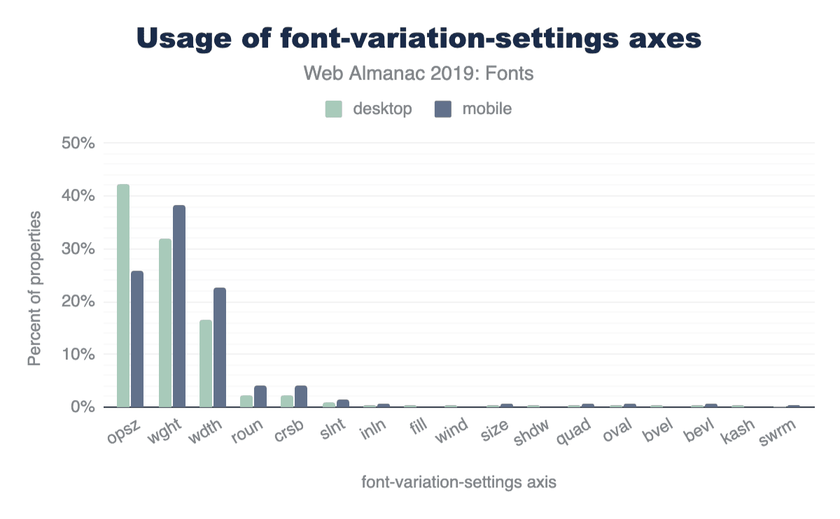 opsz value, 32% to wght, 16% to wdth, 2% or fewer to roun, crsb, slnt, inln, and more. The most notable differences between desktop and mobile pages are 26% usage of opsz, 38% of wght, and 23% of wdth.font-variation-settings axes.