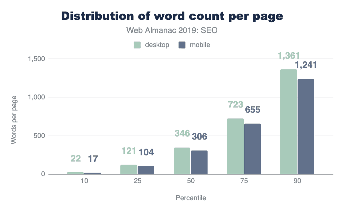 The median desktop home page has 346 words, and the median mobile home page has a slightly lower word count at 306 words. This shows that mobile sites do serve a bit less content to their users, but at over 300 words, this is still a reasonable amount to read. This is especially true for home pages which will naturally contain less content than article pages, for example. Overall the distribution of words is broad, with between 22 words at the 10th percentile and up to 1,361 at the 90th percentile.