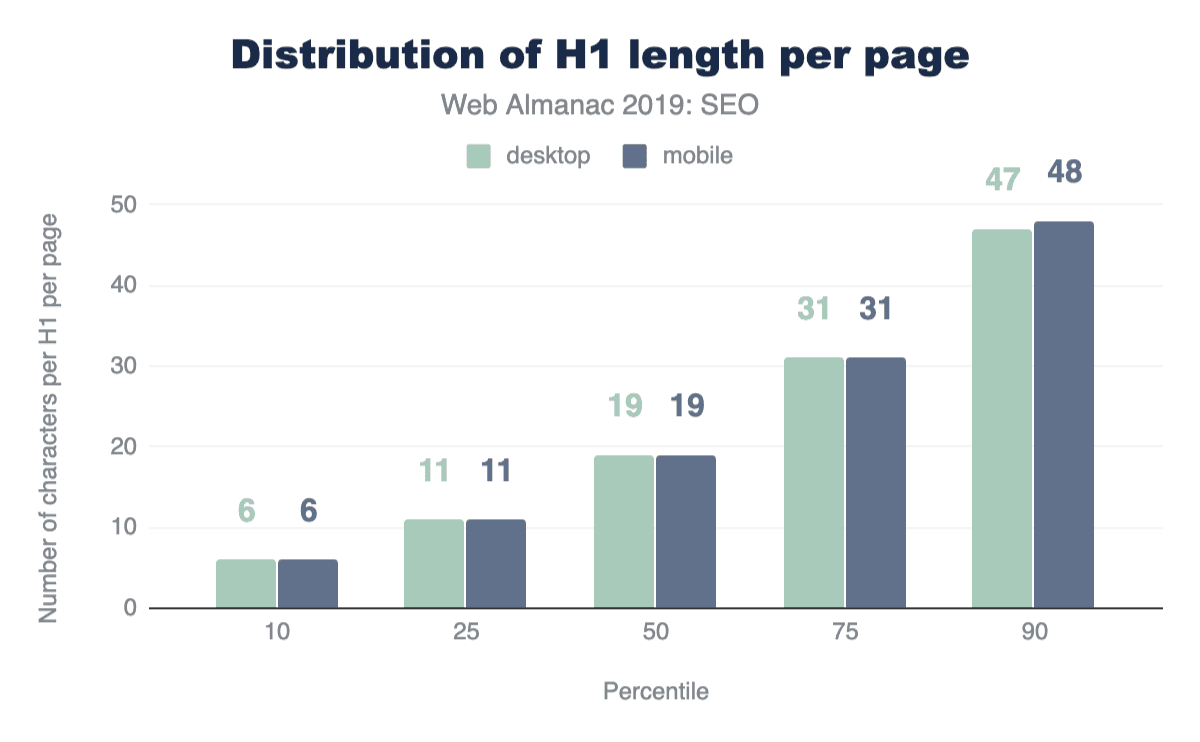 In terms of specific heading length, the median length of the first H1 element found on desktop is 19 characters.
