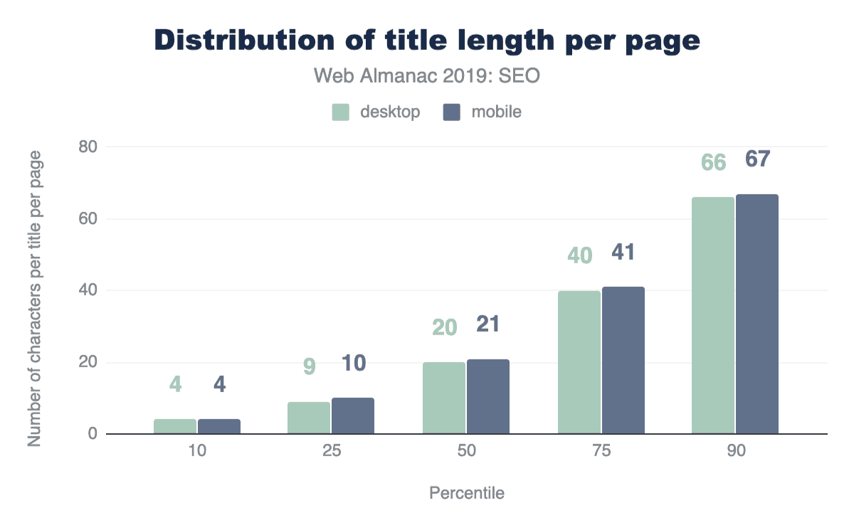 Even though Google usually displays the first 50-60 characters of a page title within a SERP, the median length of the <title> tag was only 21 characters for mobile pages and 20 characters for desktop pages. Even the 75th percentile is still below the cutoff length. This suggests that some SEOs and content writers aren’t making the most of the space allocated to them by search engines for describing their home pages in the SERPs.