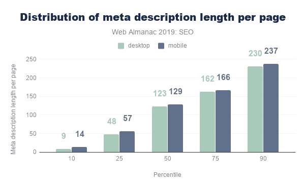 The median meta description length was also lower than the recommended length of 155-160 characters, with desktop pages having descriptions of 123 characters. Interestingly, meta descriptions were consistently longer on mobile than on desktop, despite mobile SERPs traditionally having a shorter pixel limit. This limit has only been extended recently, so perhaps more website owners have been testing the impact of having longer, more descriptive meta descriptions for mobile results.