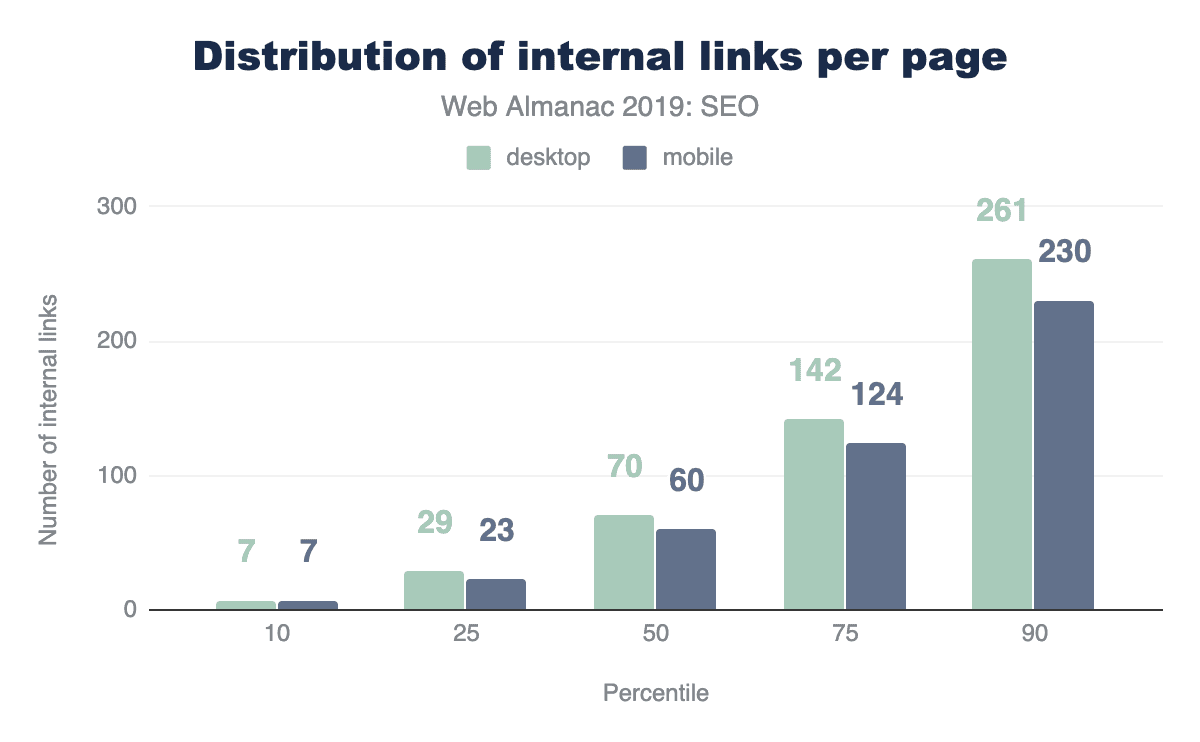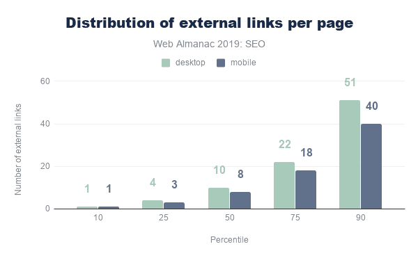 The median desktop page includes 70 internal (same-site) links, whereas the median mobile page has 60 internal links. The median number of external links per page follows a similar trend, with desktop pages including 10 external links, and mobile pages including 8.