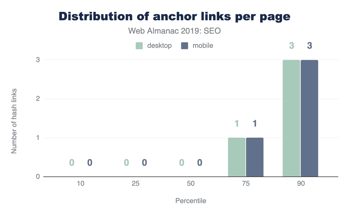 Anchor links, which link to a certain scroll position on the same page, are not very popular. Over 65% of home pages have no anchor links. This is probably due to the fact that home pages don’t usually contain any long-form content.