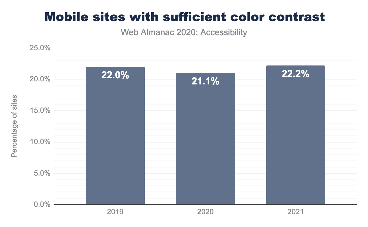 This year we found that only 22% of sites have passing color contrast scores in Lighthouse. It is worth noting that these scans are only able to catch text-based contrast issues, as non-text content is so variable. This score has stayed about the same year over year; it was 21% in 2020 and 22% in 2019. This metric is somewhat disheartening, as catching text-based contrast issues is possible with a variety of common automated tools.
