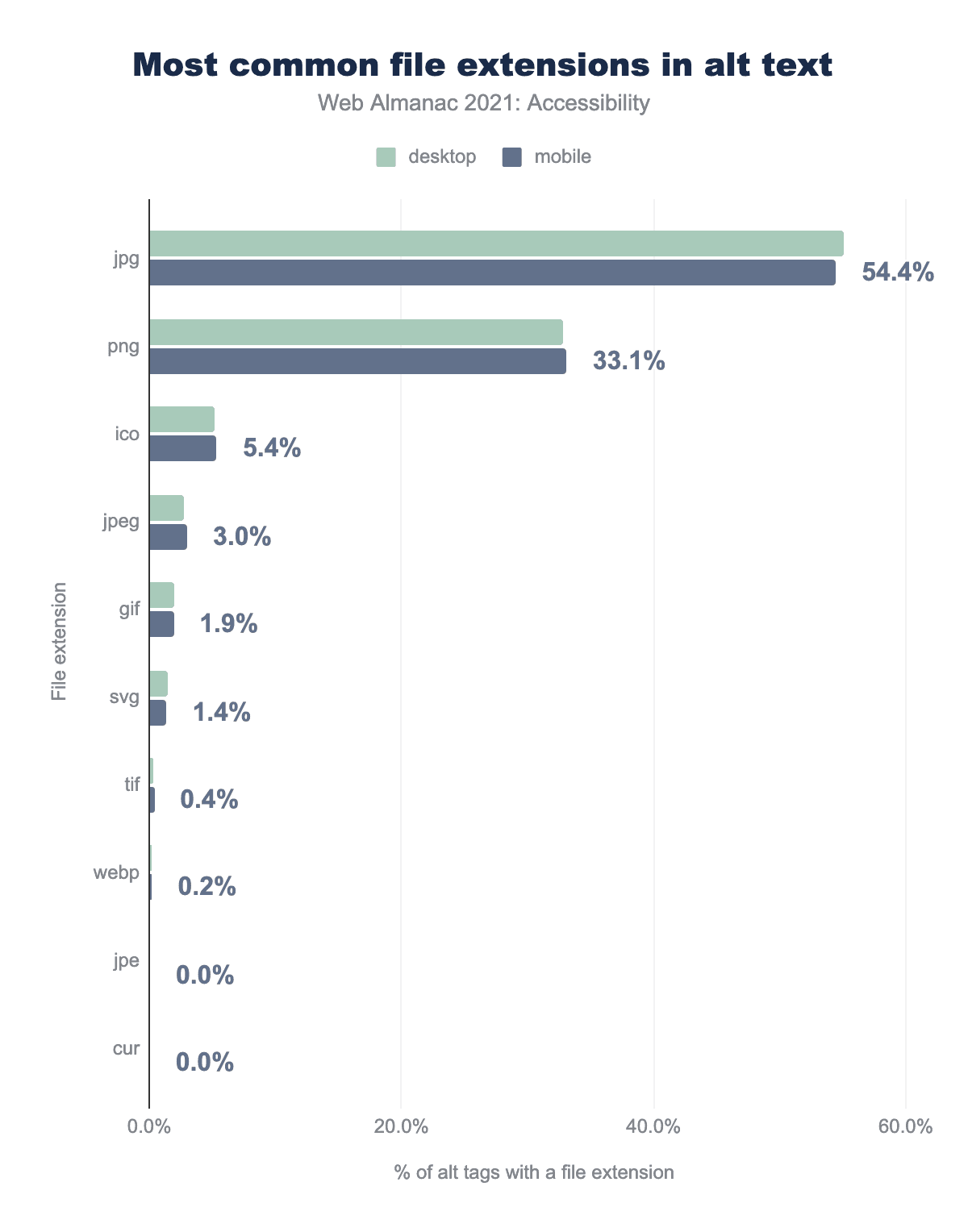jpg is used 55.1% of the time on desktop sites and 54.44% for mobile, png is 32.8% and 33.11% and respectively, ico is 5.2% and 5.36%, jpeg is 2.8% and 3.00%, gif is 2.0% and 1.92%, svg is 1.5% and 1.36%, tif is 0.3% and 0.38%, webp is 0.2% and 0.21%, jpe is 0.0% and 0.05%, and finally cur is 0.0% and 0.03%.alt text.