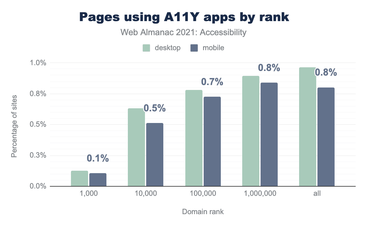 When considering domain rank, the top 1,000 websites have a lower percentage —0.1%— of overlay usage. However, considering the reach of these top-ranking sites, the potential impact of even one website with this much traffic using an overlay is very substantial.