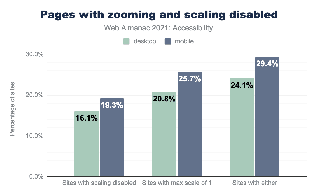 We found that 24% of desktop home pages and 29% of mobile home pages attempt to disable scaling by setting either maximum-scale to a value less than or equal to 1, or user-scalable set to 0 or none.
