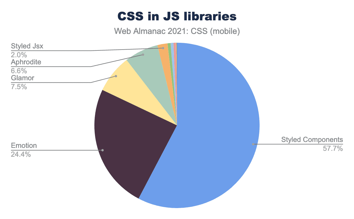 While the topic of “CSS in JS” is good for at least a Twitter flame war or two, its use in the wild continues to be very small. This year, we found that about 3% of pages are using some form of CSS-in-JS, up from 2% in 2020. Furthermore, nearly all of it comes from libraries built for the purpose, and more than half of that usage is from the Styled Components library.
