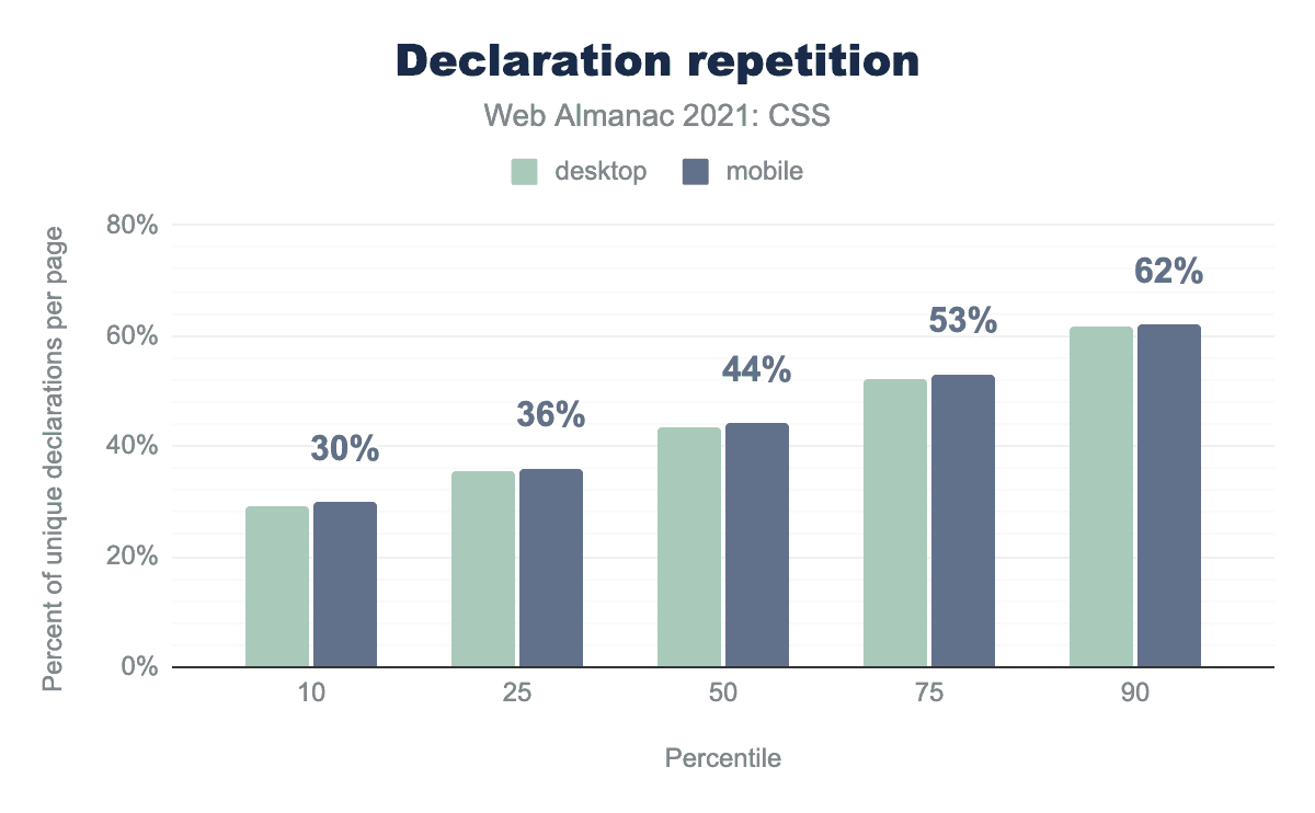 In the 2020 Web Almanac, analysis was done to determine the amount of “declaration repetition”—a metric meant to roughly estimate the efficiency of a stylesheet by determining how many declarations used the same property and value, and how many were unique within the page’s styles.