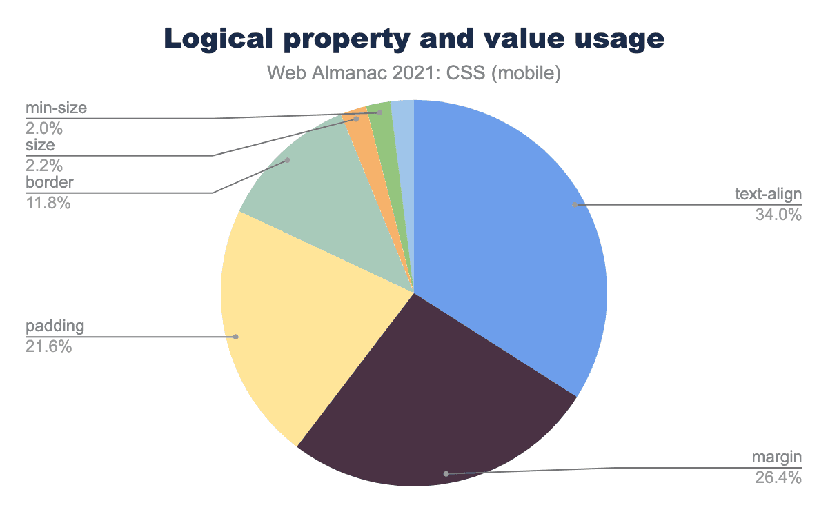 As of mid-2021, only 4% of pages were found to be using logical properties of any kind. Of the pages that did, about 33% were using it to set text-align to start or end. Another 46% or so (combined) were setting logical margins and padding. Again, note that there could be overlap in these figures.