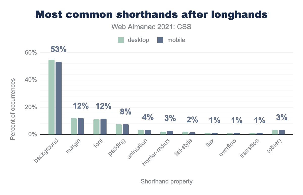 Just as was the case in 2020, the shorthand font came in behind all of its common longhand counterparts, with font-size leading the way and taking the top spot from last year’s winner, font-weight.