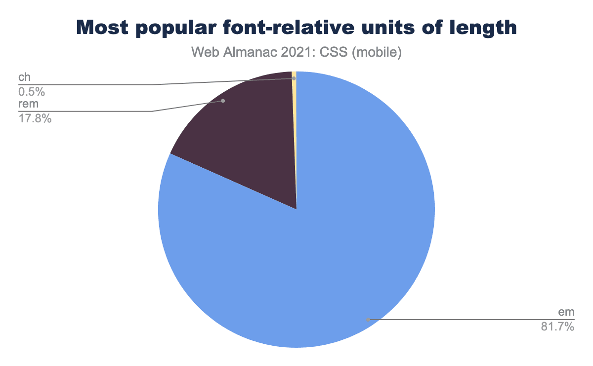 Although em maintains a huge dominance over rem when it comes to sizing fonts, there are signs of change: there was a seven-point swing from em to rem between 2020 and 2021.