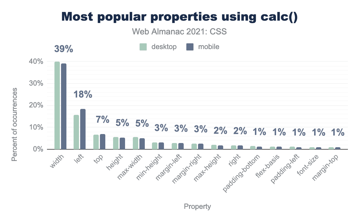 As in past years, the most popular usage of calc() is to set widths, although the share of calc() values in width dropped a full 20 points as compared to 2020. This seems most likely to reflect an expansion of calc() use in other properties, rather than a contraction of its use for width.