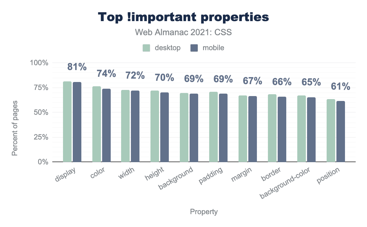 As for what !important gets applied to, as with last year, it’s display, with the rest of the chart falling in the same order as in 2020—with the exception of the last item on the chart, where position bumped off float.