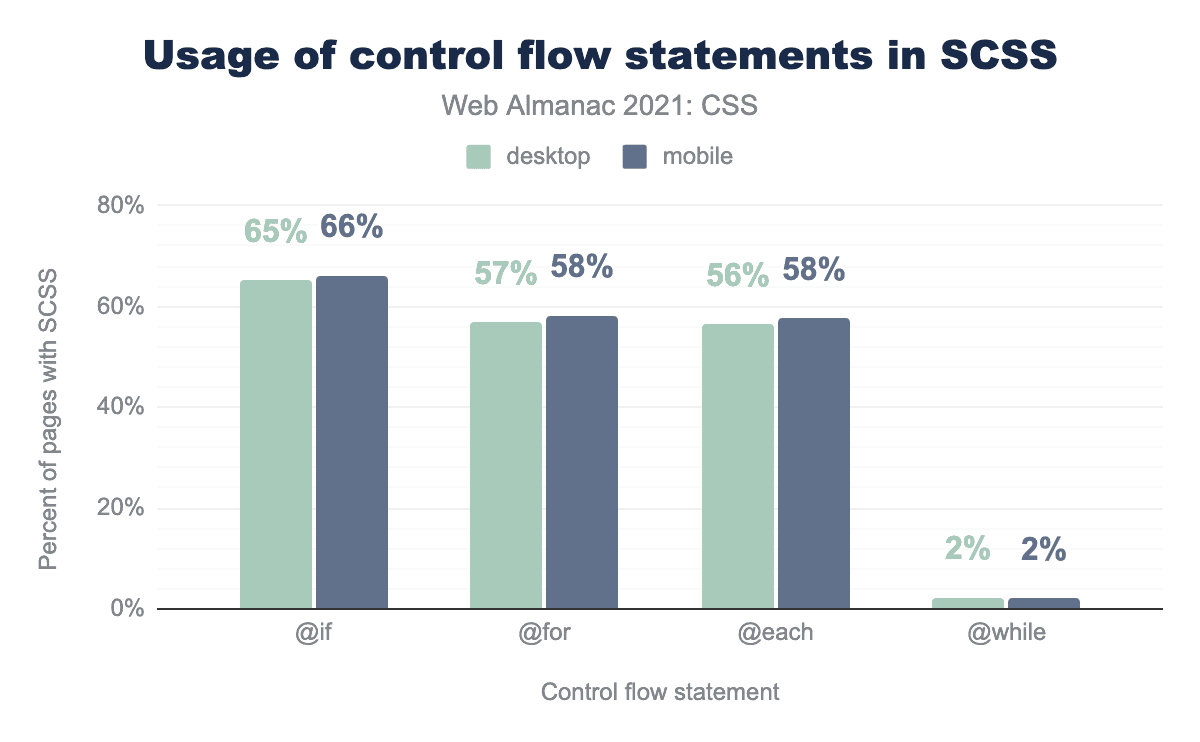 This same desire can be seen even more clearly in the use of Sass’s flow control structures, like @if. Literally two-thirds of all Sass stylesheets use @if, and more than half use @for or @each (or both). This popular capability was recently added to CSS. By contrast, only 2% use the @while structure.