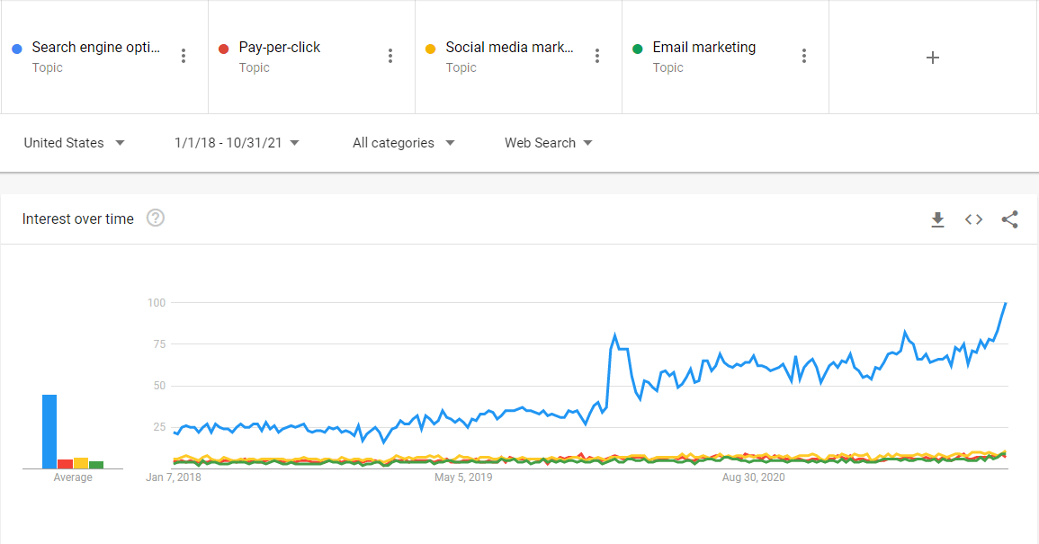 Google Trends comparison of SEO versus pay-per-click, social media marketing, and email marketing.