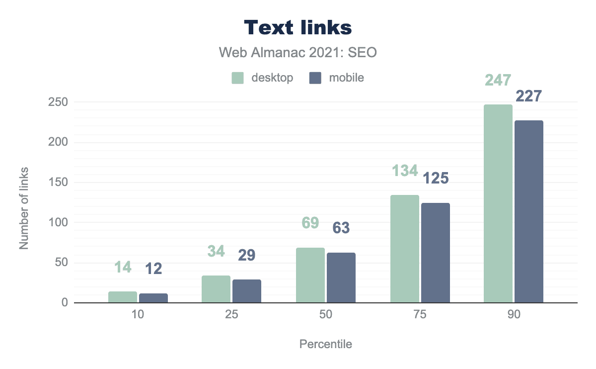 The data shows that the median number of internal links on desktop is 16% higher than mobile, 64 vs 55 respectively. It’s likely this is because developers tend to minimize the navigation menus and footers on mobile to make them easier to use on smaller screens.