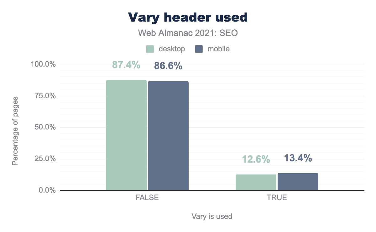 For the Vary: User-Agent header, the numbers were pretty much unchanged with 12.6% of desktop pages and 13.4% of mobile pages with this footprint.