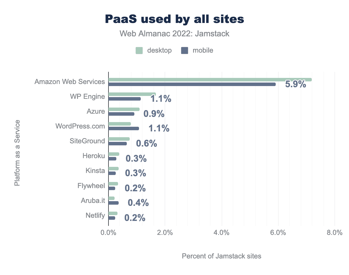 Absent from all the platform lists is web giant Cloudflare, which Wappalyzer categorizes as a CDN rather than a PaaS. Although Cloudflare has a PaaS offering that is very Jamstack-y, called Cloudflare Pages, Wappalyzer data does not distinguish between “hosted on a CDN” and “hosts some assets on that CDN” so we could not include it in this analysis. The author believes that Cloudflare is a very popular Jamstack hosting option, but we do not have good data to verify this.