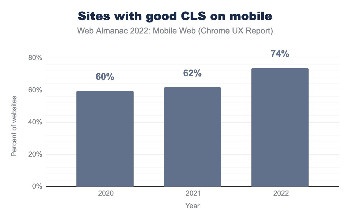The percentage of websites with “good” CLS on mobile has improved significantly to 74%, up from 62% last year.