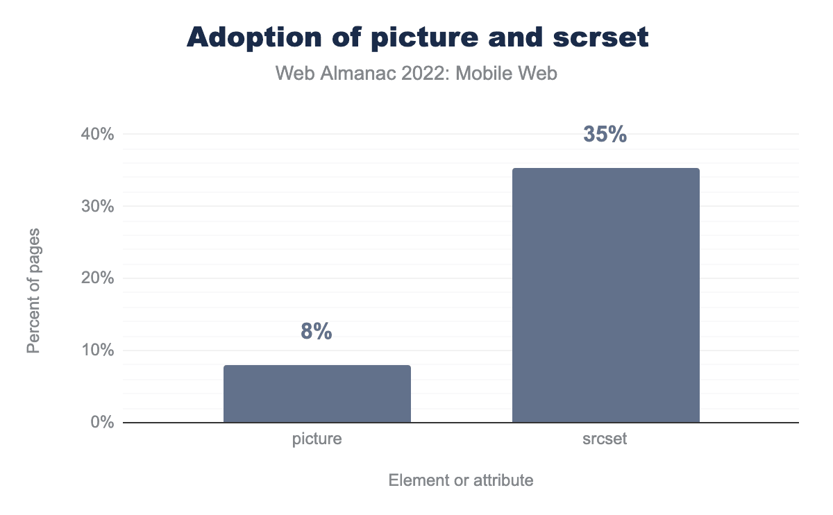 The adoption of the picture element is at only 8% of mobile pages (up from 6% last year), but srcset is at 35%. In 2021, the use of srcset was around 32%, so we have seen a growth of about 3 percentage points.