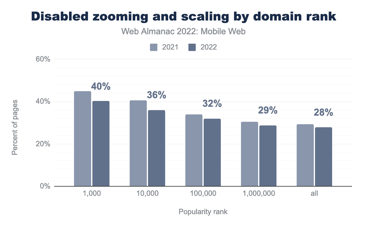 Of the mobile websites in the top 1,000 rank, 40% of them had disabled zooming and scaling, down from about 45% in 2021. When you look at the top 10,000, 36% of mobile sites had disabled scaling and zooming, and this is down from about 41% in 2021. Looking at the other end of the scale, the widest ranking group, which includes all the sites in the data set, 28% of sites prevented zooming and scaling, down from about 29% in 2021. Overall, what we can see here is that the prevalence of this accessibility-limiting setting is on the decline, especially for the most popular sites, which is good news, but the fact that more than half of the sites are still using this type of limiting setting is disappointing.