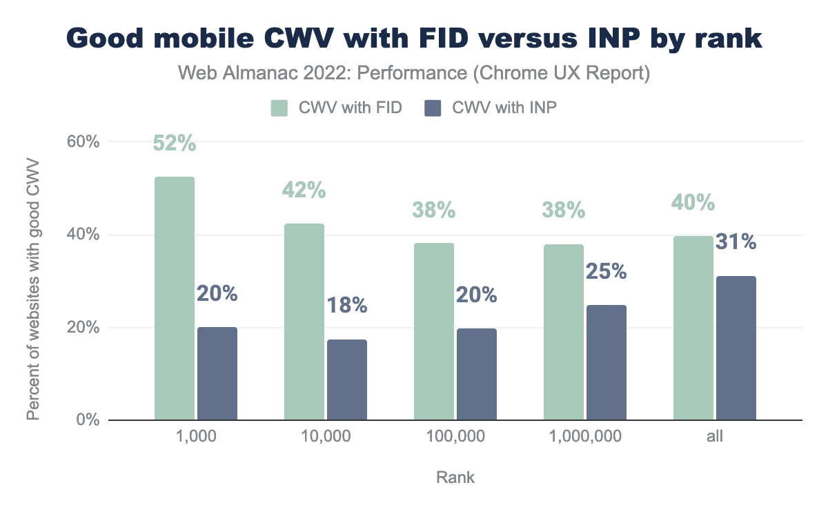 The situation gets even starker when we look at mobile experiences by site rank. Rather than 52% of the top 1k websites having good CWV with FID, only 20% of them would have good CWV with INP, a decrease of 32 percentage points. So even though the most popular websites overperform with FID compared to all websites (52% versus 40%), they actually underperform with INP (20% versus 31%).