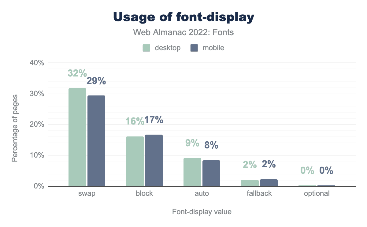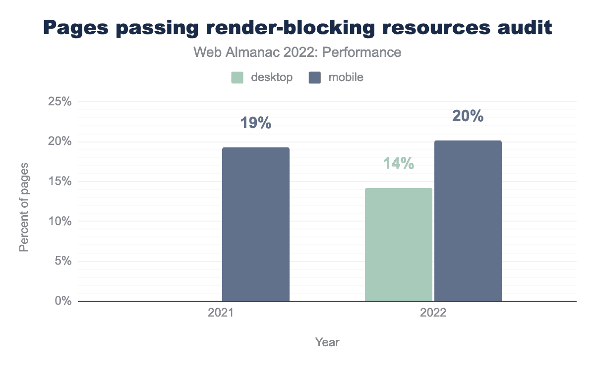 Surprisingly, there was no dramatic improvement in the percent of pages that have render-blocking resources. Only 20% of mobile pages pass the audit, which is a mere 1 percentage point increase over last year.