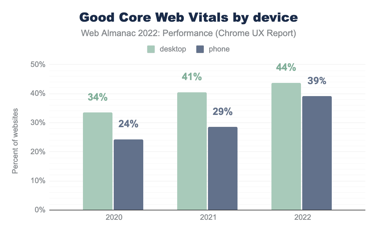 In 2021, 29% of websites were assessed as having good CWV for mobile users. This was a significant step up from 2020, representing a 5 percentage point increase. However, the progress in 2022 was an even bigger leap forward, now with 39% of websites having good CWV on mobile—representing a further 10 point increase!