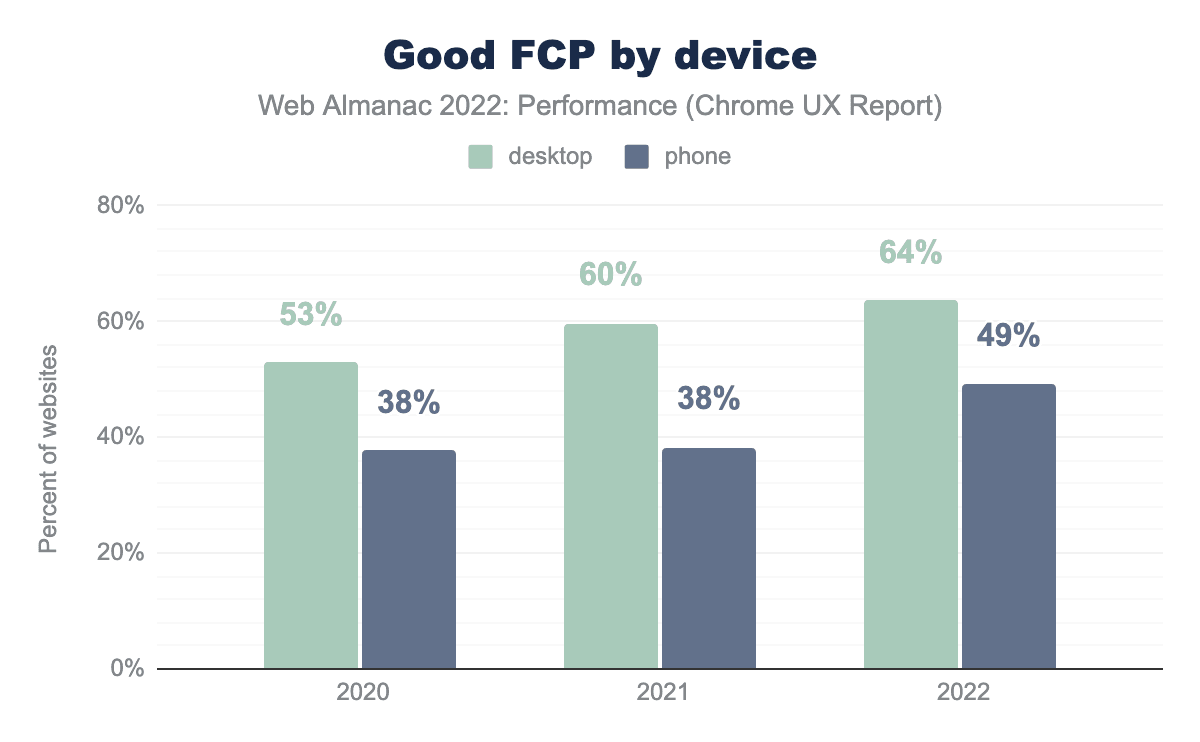 Figure 12.5. The percent of websites having good FCP, segmented by device and year.