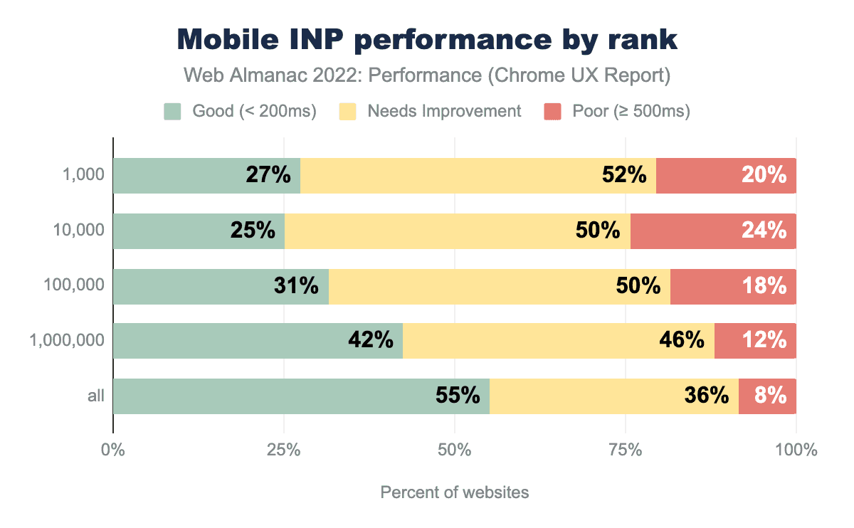 These results show that the most popular websites have the most work to do to get their INP into shape.