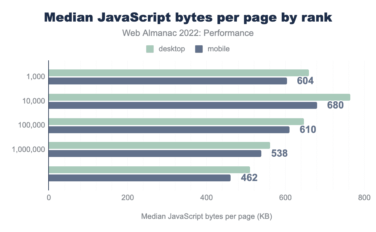 When we look at the amount of JavaScript that the median mobile page loads for each of these ranks, it follows the same funny pattern! The median mobile page in the top 1k loads 604 KB of JavaScript, then it increases to 680 KB for the top 10k before dropping all the way down to 462 KB over all websites. These results don’t prove that loading—and using—more JavaScript necessarily causes poor INP, but it definitely suggests a correlation exists.