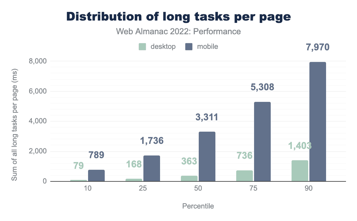 The median mobile web page has 3.3 seconds-worth of long tasks, compared to only 0.4 seconds for desktop pages. Again, this shows the outsized effects of CPU speed on responsiveness heuristics. At the 90th percentile, mobile pages have at least 8.0 seconds of long tasks.