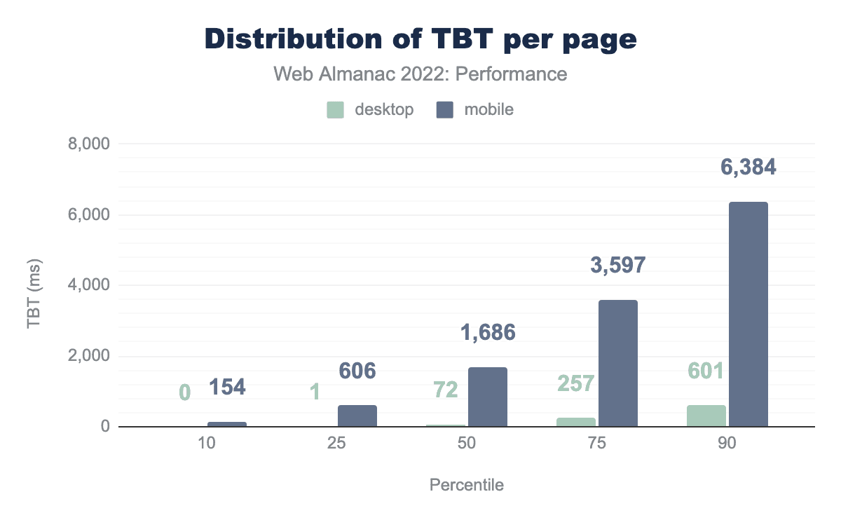 Note that these results are sourced from the lab-based TBT performance of pages in the HTTP Archive dataset. This is an important distinction because for the most part we’ve been looking at real-user performance data from the CrUX dataset.