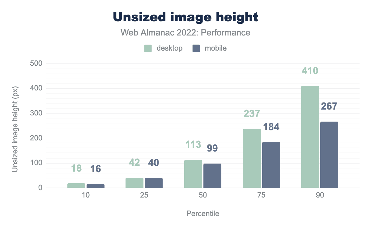 It’s clear that images are the most common type of LCP content, with the img element representing the LCP on 42% of mobile pages. Mobile pages are slightly more likely to have heading and paragraph elements be the LCP than desktop pages, while desktop pages are more likely to have image elements as the LCP. One possible explanation is the way that mobile layouts—especially in portrait orientation—make images that are not responsive appear smaller, giving way to large blocks of text like headings and paragraphs to become the LCP elements.