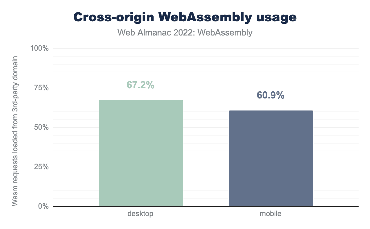 A significant proportion of wasm requests are cross-origin, further reinforcing the notion that they are re-used. Notably this has increased significantly from last year (67.2% vs 55.2%).