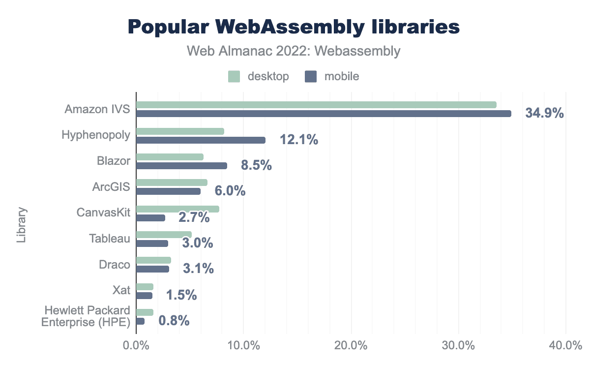 We found slightly fewer (-13%) WebAssembly modules served to mobile browsers. This isn’t a reflection on the WebAssembly capabilities of mobile browsers, which generally have excellent support. Rather, it is likely due to the standard practice of progressive enhancement, where in these cases the more advanced features that require WebAssembly are not supported for mobile users.