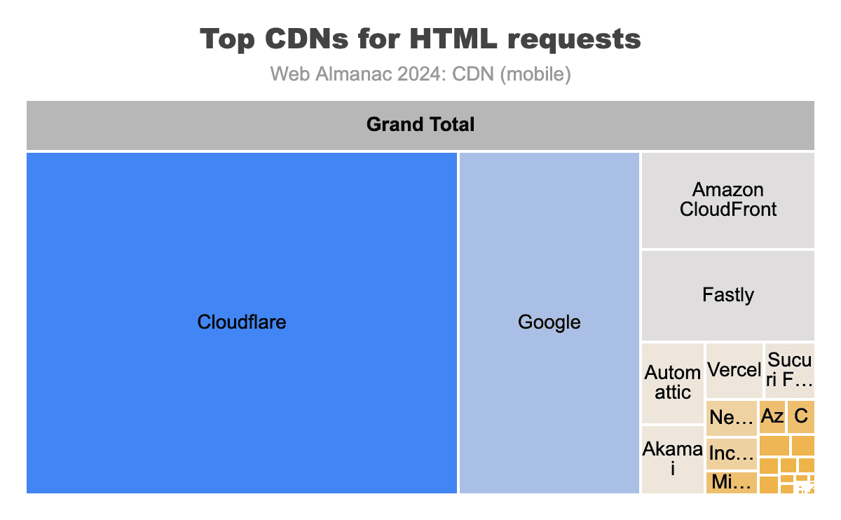 The above figure shows the top CDN providers for base HTML requests. The leading vendors in this category are Cloudflare, with a 55% share, followed by Google (23%), Amazon CloudFront (6%), Fastly (6%), Akamai (2%), and Automattic and Vercel, each with a 1% share.
