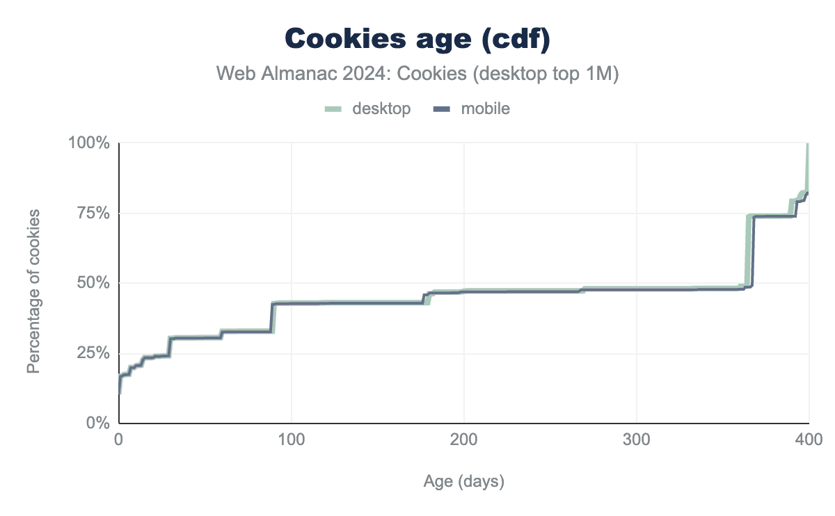 After looking into cookie size, let’s now dive into cookie age. Cookies are set to an expiration date when they are created. Recall that session cookies expire immediately after the session is over (see previous section). The median age of first-party cookies is at about 183 days or roughly 6 months, while the median age of third-party cookies is a full year. After less than one day and thirty days, 25% of first-party and third-party cookies expire, respectively. The maximum age among the cookies that we can observe with the instrumentation and collection of the HTTP Archive Tools is of 400 days, this is aligned with the hard limits that Chrome imposes on cookie Expires and Max-Age attribute. Below, are the cumulative distribution functions (cdf) of the age of the cookies set on the top one million websites whether it is on a desktop or mobile client.