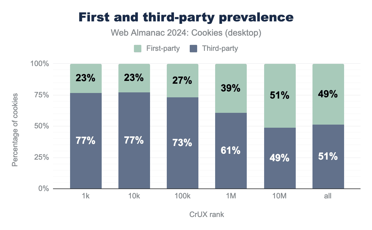 First-party cookies are set by the same domain as the website that the user is visiting, while third-party cookies are set by a different domain see Definitions. In this analysis, we examine the percentage of cookies set on websites that are first- and third-party across clients (desktop or mobile) and CrUX ranks.