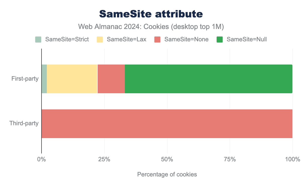 SameSite attribute and its value for both first-party and third-party cookies on desktop clients. 2.16% of first-party cookies set the SameSite attribute to Strict, 20.17% use SameSite=Lax (which is the default), 10.78% set the value to None and 66.89% do not specify the value of SameSite. Nearly 100% of third-party cookies set the SameSite attribute to None, in order for these cookies to be sent in a cross-site context.SameSite attribute for cookies on desktop client.