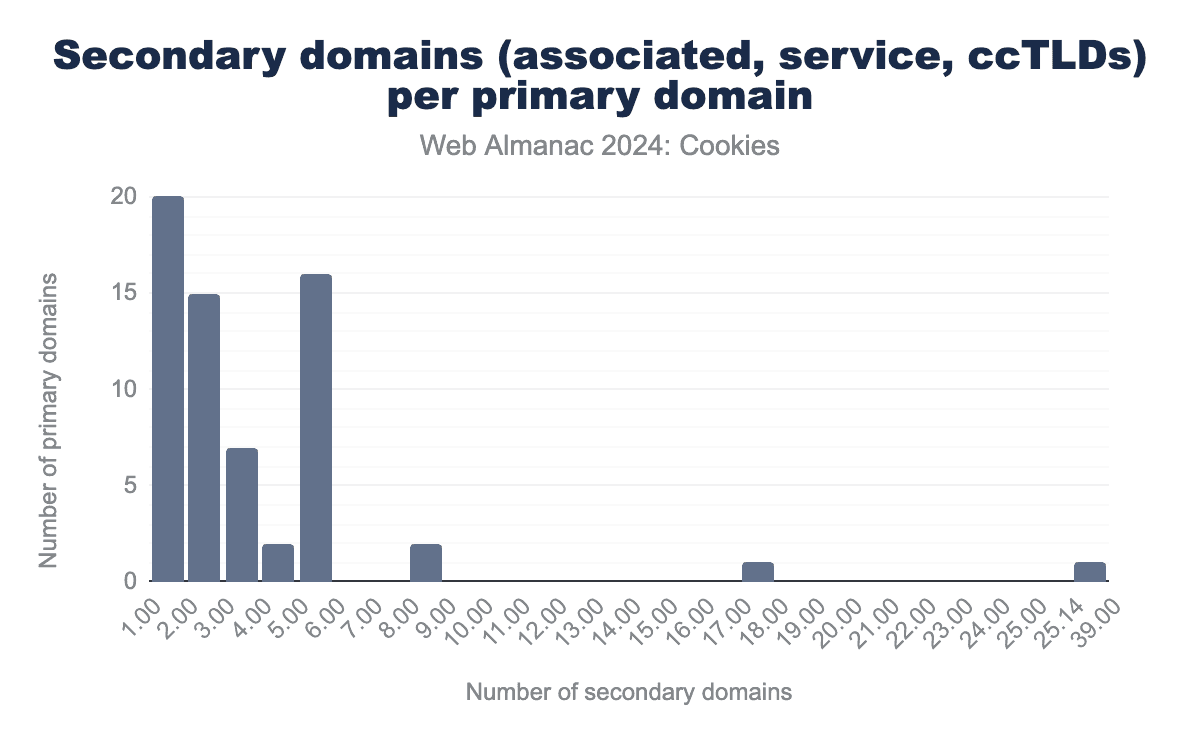 Chrome ships with a preloaded file containing related website sets validated by the Chrome team; at the moment of writing (version 2024.8.10.0), there are 64 distinct related website sets. Each related website set contains a primary domain and a list of other domains related to the primary one below one of the following attributes: associatedSites, servicesSites, and/or ccTLDs. These 64 primary domains are each associated with secondary domains as part of their set: 60 sets contain associatedSites, 11 servicesSites, and 7 ccTLDs. We report on the following figure the number of secondary domains for each set. We observe that if a majority of the primary domains are associated with 5 or less secondary domains, https://journaldesfemmes.com, https://ya.ru, and https://mercadolibre.com are linked to 8, 17, and 39 secondary domains among which third party requests are handled as if they were all from the first party, respectively.