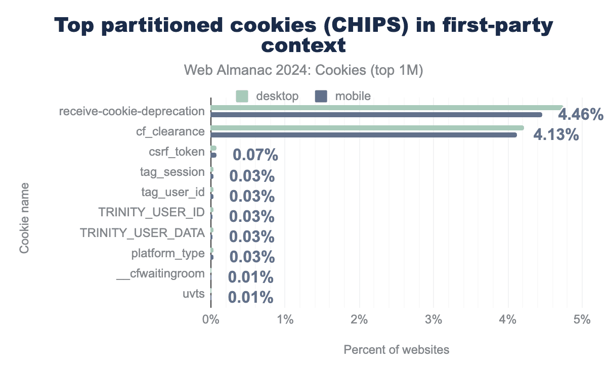 YSC and VISITOR_INFO1_LIVE are set by youtube.com on 9.9% of desktop websites and 8.9% of mobile websites. Most of the top domains using CHIPS belong to the advertising or analytics category.Perhaps a bit surprising, 1% of all the first-party cookies that are set on the top one million websites (desktop and mobile client) are partitioned. However, partitioning cookies in a first-party context appears to be a bit redundant as first-party cookies are already accessible, by definition, only by that first-party on that top-level site. The following figure displays the top ten partitioned cookies set in first-party context for each client. receive-cookie-deprecation is set by domains that participate in the testing phase of Chrome’s Privacy Sandbox. cf_clearance and csrf_token are cookies set by Cloudflare to indicate that the user has successfully completed an anti-bot challenge or to identify trusted web traffic, respectively.