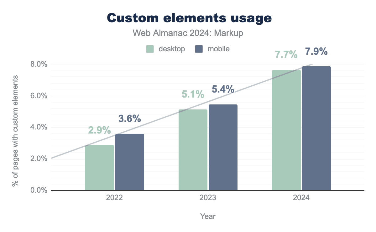 The usage of custom elements has seen a significant increase in recent years, with adoption rates rising from 3.6% on mobile in 2022 to 7.9% in 2024. This increase highlights a growing trend among developers and technologies to leverage custom elements for building richer, more interactive web experiences.