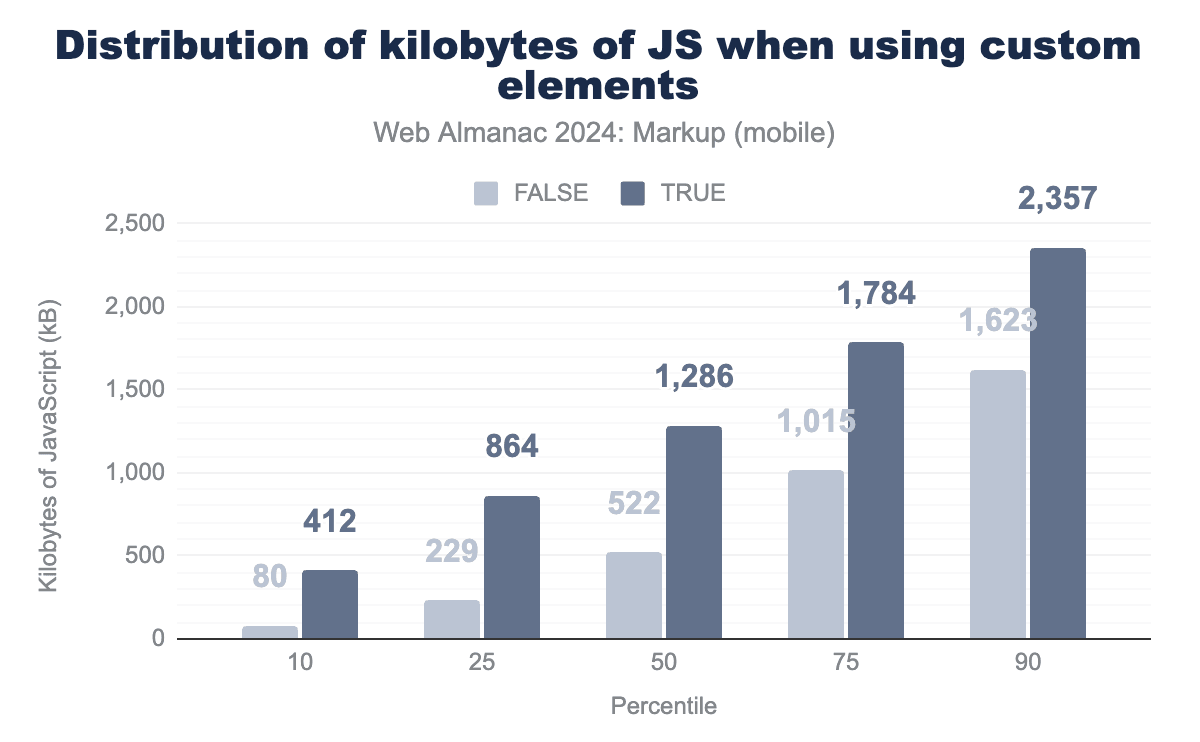 In this chart, we can see that at the median, pages with custom elements use 1,286 kB of JavaScript while pages without custom elements only require 522 kB. Hence, while the rise of custom elements represents a valuable evolution in web development—enabling developers to create modular and reusable components—it’s essential to consider the implications of their use.
