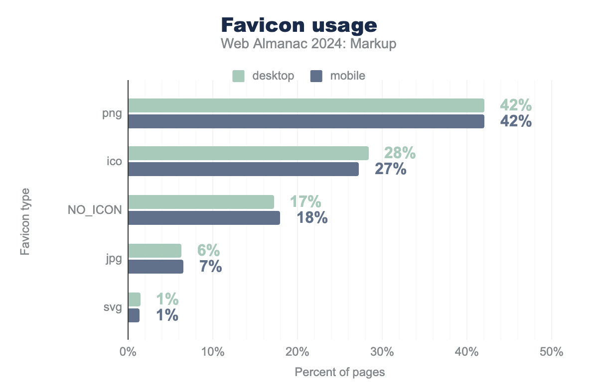 As of 2024, .png is the most commonly used format for favicons informed by <link rel="icon"> tags, appearing on 42% of mobile pages, up from 35% in 2021. In contrast, the use of .ico files has decreased from 33% in 2021 to 27%, likely due to developers moving away from this format in favor of other options like .png and .svg. However, it’s interesting to highlight that .svg favicons are not supported on Safari.