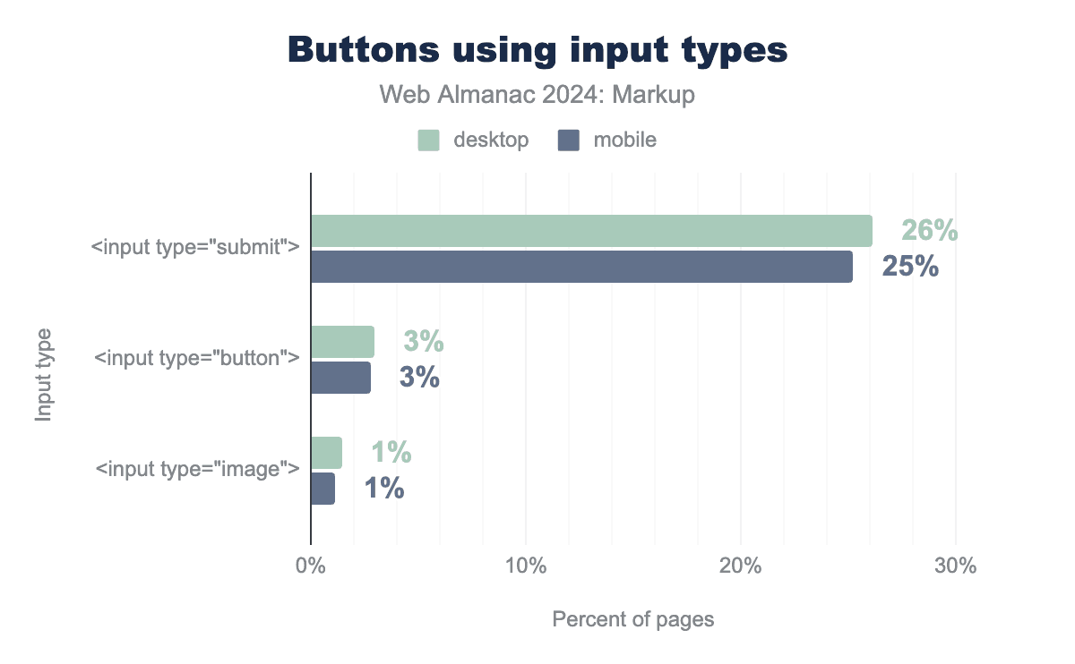 Data shows that 25.2% of mobile pages in our data set have at least one <input type="submit"> element, 2.8% have at least one <input type="button"> element, and 1.1% have at least one <input type="image"> element.