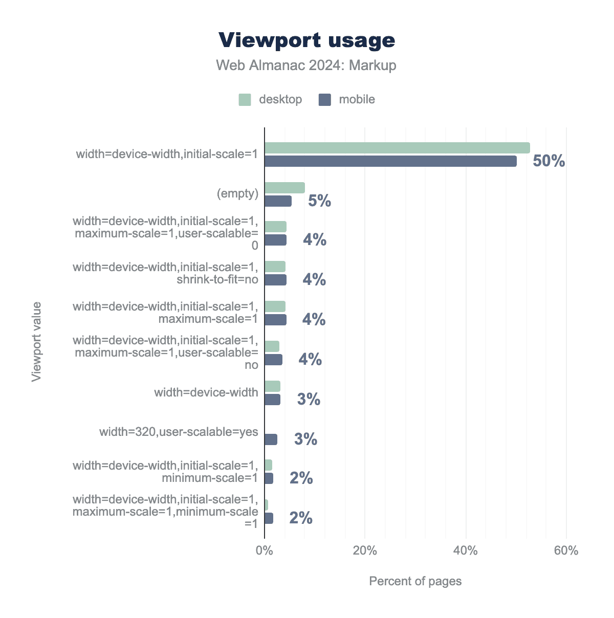 In terms of current usage, the most common configuration is width=device-width,initial-scale=1, present on 50% of mobile pages. Interestingly, 5.4% of the pages analyzed on mobile have no viewport tag. So, these pages are not designed for mobile experiences. Other configurations include variations like width=device-width,initial-scale=1,maximum-scale=1,user-scalable=0, which disables user scaling, found on 4.4% of mobile pages.