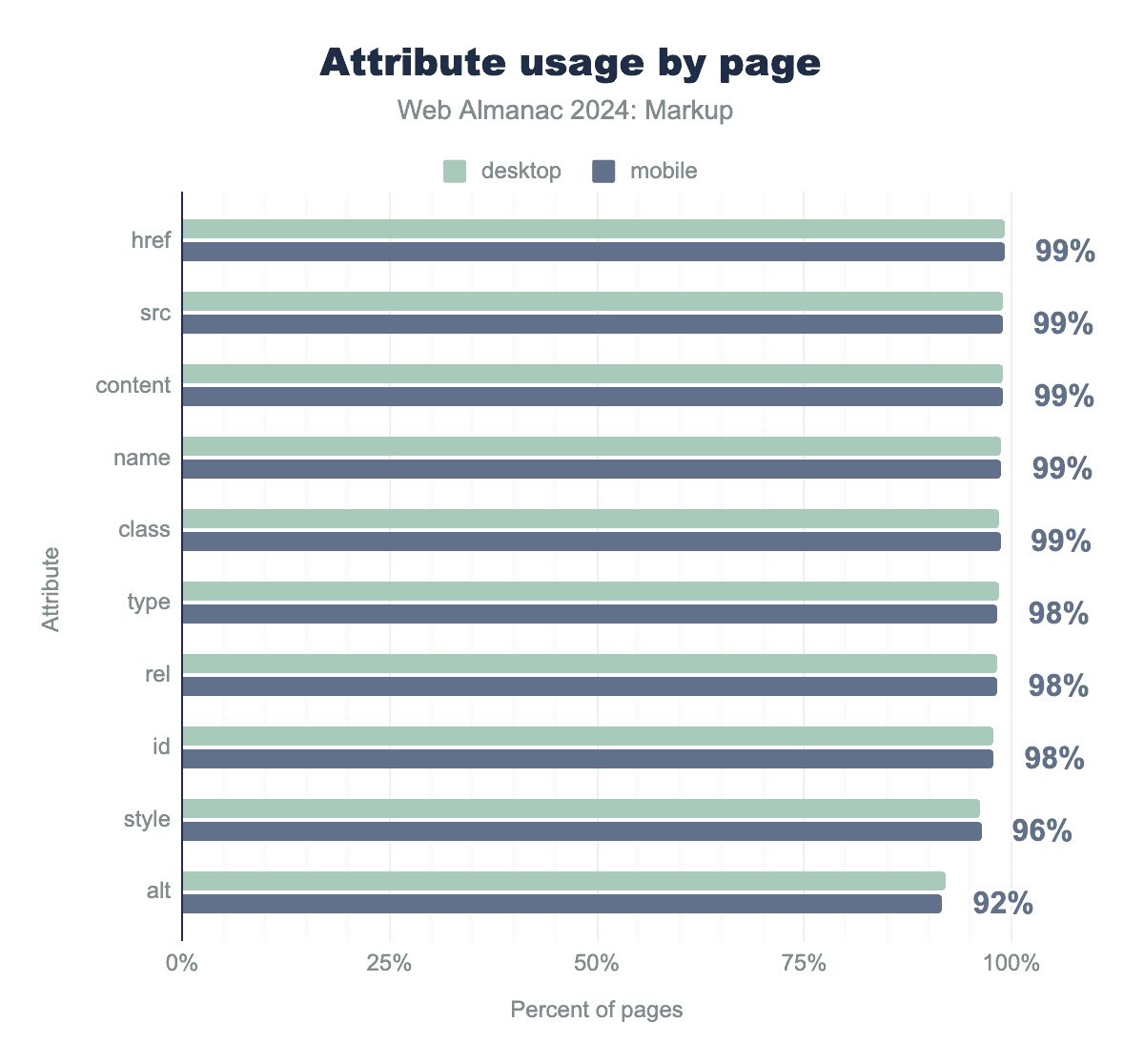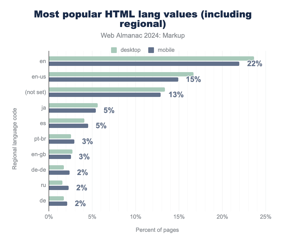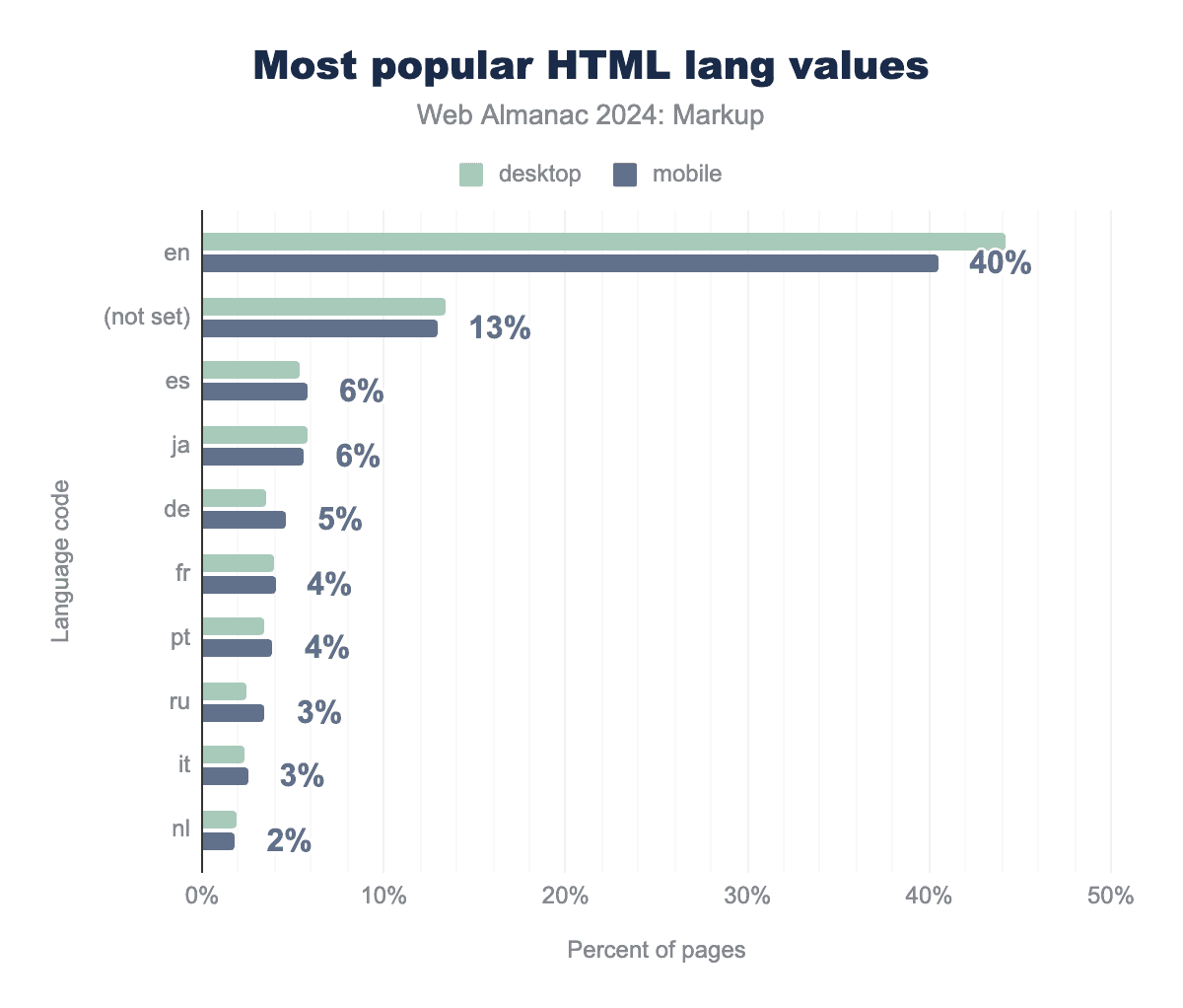 The HTML lang attribute plays an important role in helping screen readers and search engines understand the language of a webpage’s content. However, interestingly, Google Search ignores the lang attribute when determining the language of a page because they’ve identified that “it is almost always wrong”. This may explain why en remains dominant in the dataset, with 44.2% of desktop and 40.5% of mobile pages using it as the primary language attribute, even though the actual language of the content might differ.
