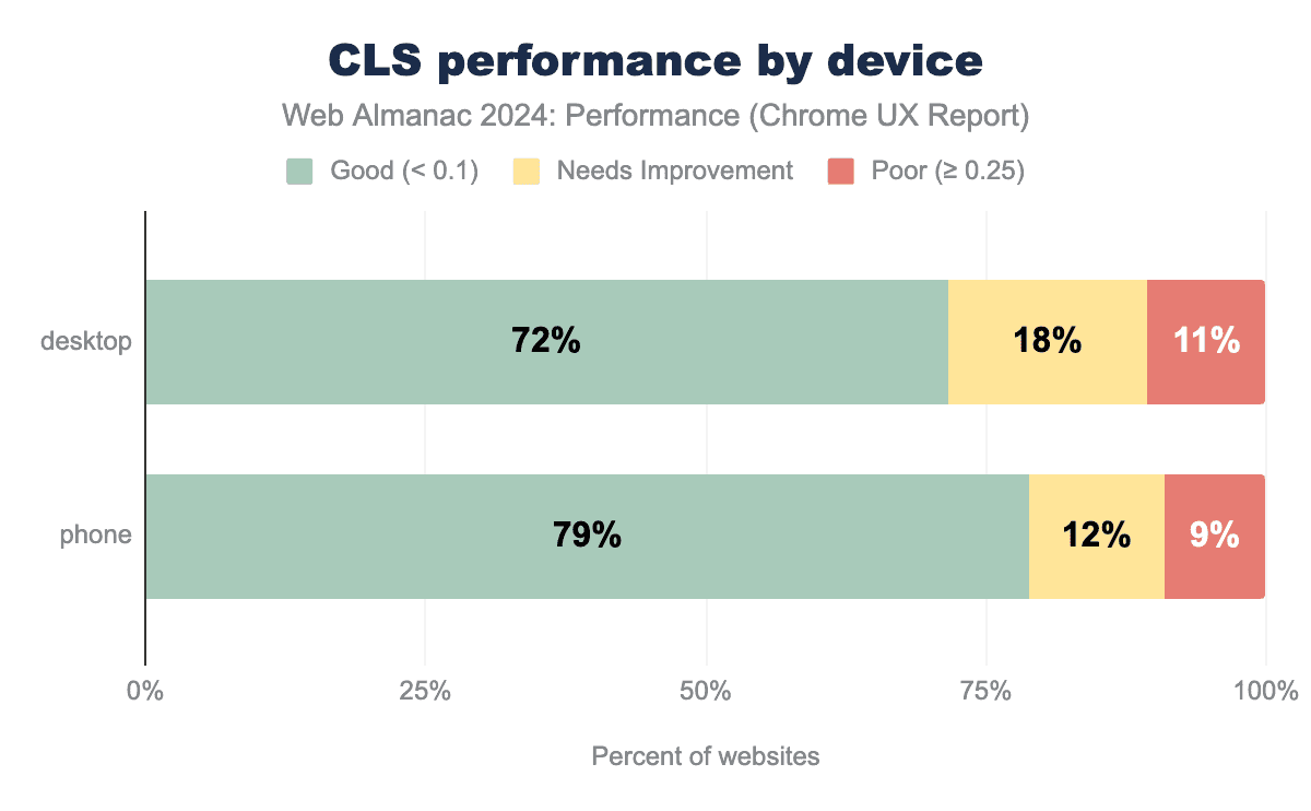 In 2024, 72% of websites achieved good CLS scores, while 11% had poor ones. We can also see that websites on mobile devices provide a better user experience when it comes to site stability than desktop sites.